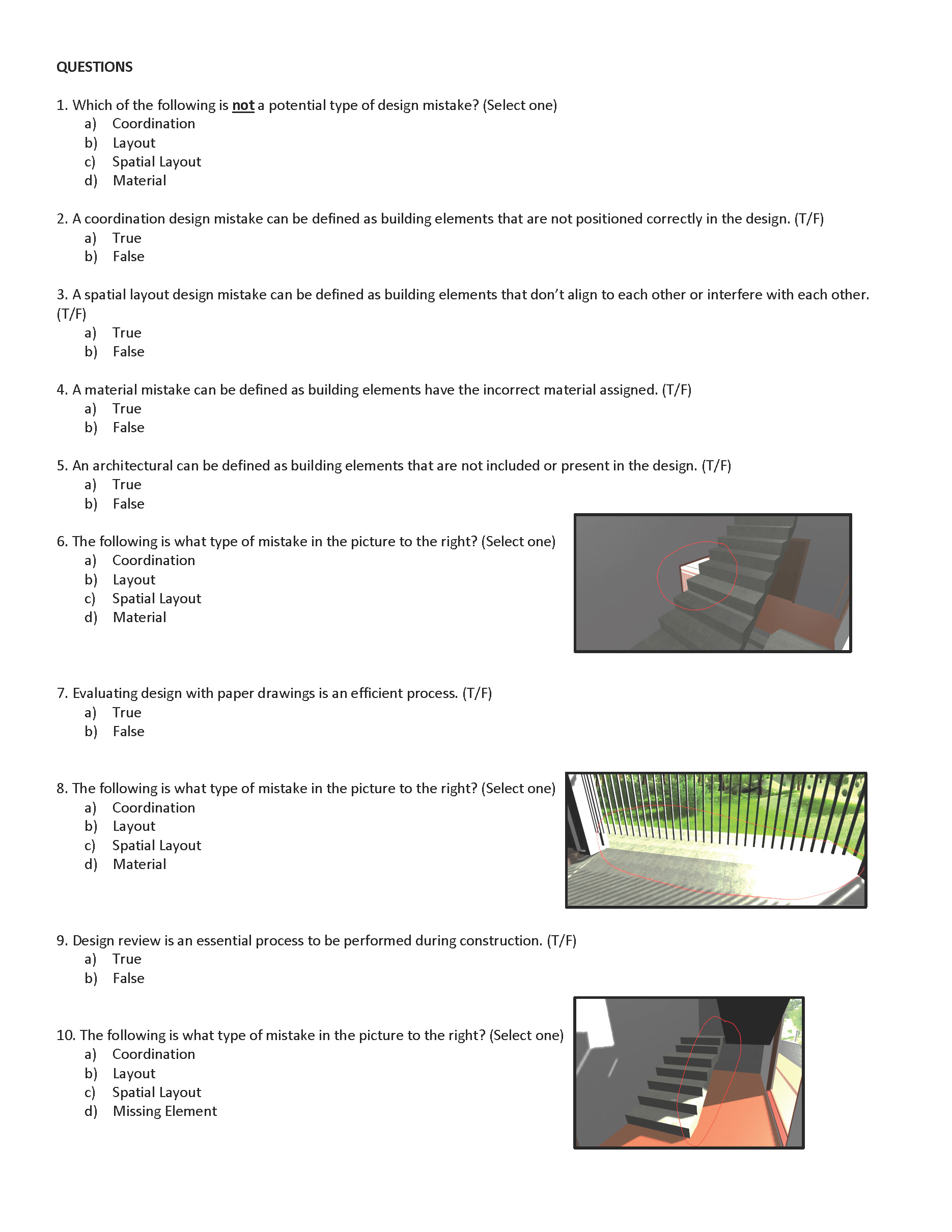 During the experiment, the students were grouped in pairs and asked to perform design reviews on the provided learning medium and document the types of mistakes on a handout that was the same for both experimental groups. On the handout, the student teams were asked to write the mistakes encountered (whether in VR or on the drawings). In particular, they had to write the mistake number, the type of mistake, and an explanation of why they chose that mistake type. The number of mistakes found by the students was used as the dependent variable of the experiment. At the end of each treatment the students were given an assessment instrument which included a set of ten multiple-choice or true-false types of questions (see assessment quiz in section 2), to test the students’ achievement of the game’s learning objectives. The number of mistakes and the assessment score was compared in a 2x2 mixed model ANOVA (observation: day 1, day 2) X (condition: drawings, VR game) with time as the repeated measure and condition as the between-subjects factor.
