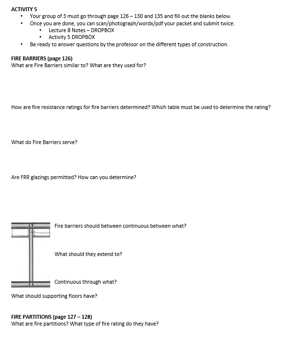 In addition to the students having to present they were challenged with a series of activities where they had to engage with the textbook to learn the building codes. Dr. Castronovo developed these in-class handouts for every chapter as a supplement to the students' lecture. These handouts were mandatory and had to be submitted to receive credit for the class activity. Additionally, the students had to find examples of the codes section in the building where the class was hosted.