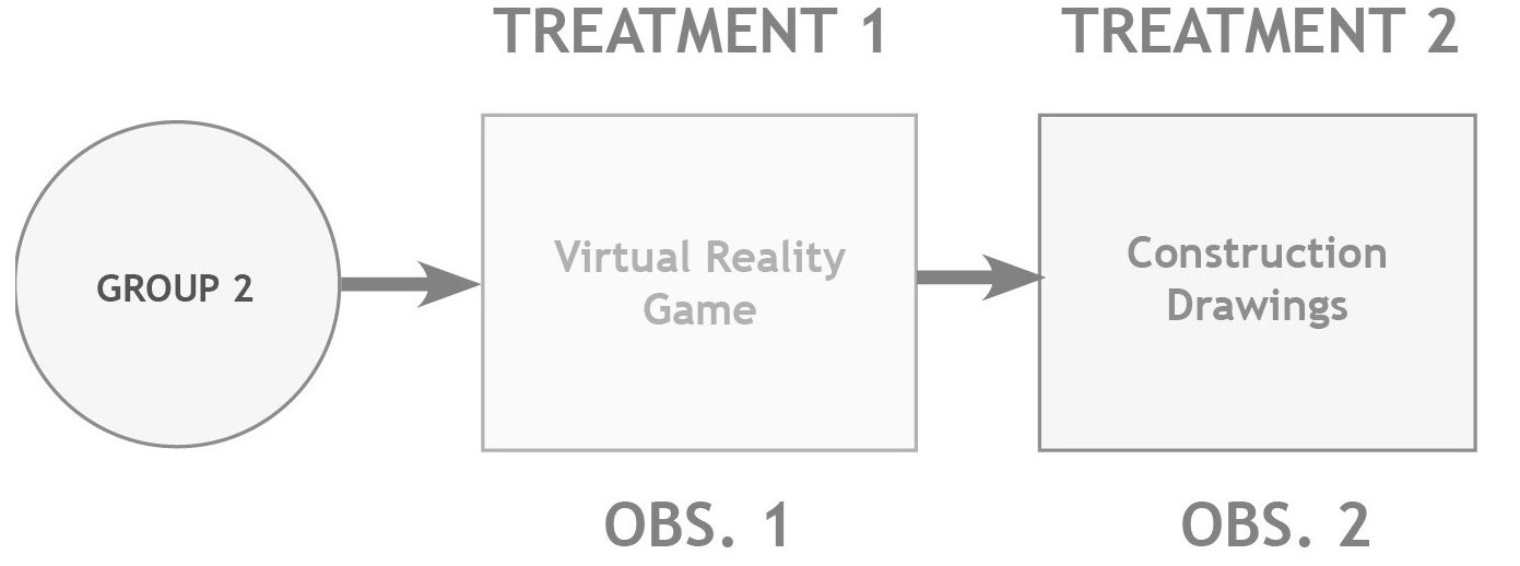A mixed-design crossover repeated-measures experimental design was set up to determine the gains in problem-solving skills that construction students gained from playing the DRS. This design method was chosen to control the potential sequencing effects of an independent variable (i.e. the learning medium) and treatment contamination. This experimental design allows testing of both between-subject and within-subject differences (see figure below), as well as a comparison of the two groups at the time of the first treatment to test the groups’ equivalence. Based on this design, recruited students were randomly assigned to two groups. The groups were then exposed to an independent variable, type of learning medium, with two levels of treatment -- VR game versus paper-based construction drawings. The two treatments were administered on two consecutive days respectively, and at the same time for each group, though their sequence differed for the two groups. The first group used the construction drawings on the first day and the VR game on the second day, while for the second group the sequence was reversed. The variation in sequence between the drawings and VR game tests the possibility that student learning is affected by such order.