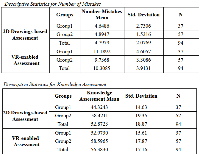 The results from the experiment can be found in the following tables. The tables list the two levels of the independent variable, the learning medium to perform design reviews as a within-subjects factor (2D drawings, VR game), the two dependent variables (knowledge assessment, number of mistakes), and order as the between-subjects factor (groups: Group 1, Group 2). For each of these variables, the means and standard deviation values are calculated. The data were analyzed using the statistical software package, IBM SPSS Statistics. In order to test the hypotheses, several analyses were conducted, such as two two-way mixed ANOVA followed by two independent T-Test and two paired-sample T-Tests. Two two-way mixed ANOVA were conducted to address the first and second hypothesis and whether the order of implementing the independent variable playing the DRS simulation game resulted in any difference in the dependent variables. In order to investigate further the group differences, two independent T-Test was performed to evaluate the difference between groups’ knowledge assessment scores. Two paired sample T-Tests were carried out to test the third and fourth hypothesis, that is if experiment resulted in higher knowledge or number of design mistakes identified.