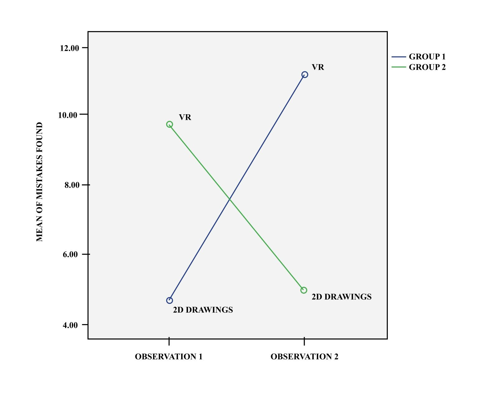 Dr. Castronovo aimed at testing hypothesis 1 and 2 which stated: “the order with which the representations modes (i.e. VR and 2D drawings) are implemented will not have an impact on the students’ ability to identify mistakes“ and “the order with which the representations modes (i.e. VR and drawings) are implemented will not have an impact on the students’ knowledge of the design review process“. In order to test these hypotheses, two Two-Way Mixed ANOVA (2x2) analyses were conducted for each dependent variable. The Two-Way Mixed ANOVA (2x2) analysis was conducted using the independent variable as a within-subjects factor (paper-based 2D drawings and DRS VR game), and order, as a between-subjects factor (Group 1: (1) drawings, (2) VR game; and Group 2: (1) VR game, (2) drawings). The interpretation of these analyses is facilitated by graphing the four mean values. These are depicted in the following figures Mean of Number of Mistakes Results, and Mean Knowledge Assessment Scores Results.