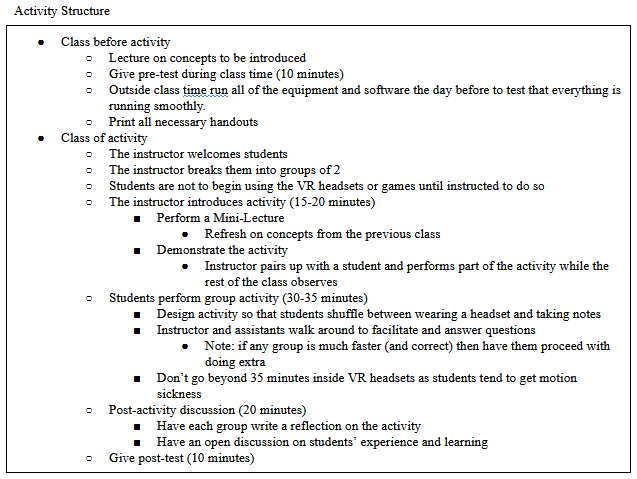 At the end of the activity, the students must reflect on their activity. Dr. Castronovo found that the reflection can be structured by first getting the students to write on their handouts and then having an open discussion. In case the instructor wants to collect any research data, the pre-test is suggested to be given the class period before the activity and the post-test be administered right after the activity has ended. While these lessons learned were collected from the implementation, Dr. Castronovo believes that they are of extreme value not only for their own future applications but also for other instructors that are interested in using VR in their classes.