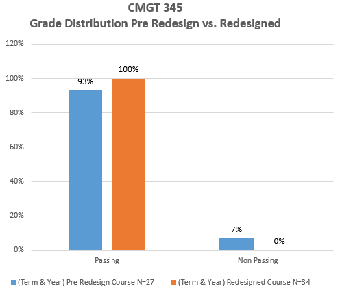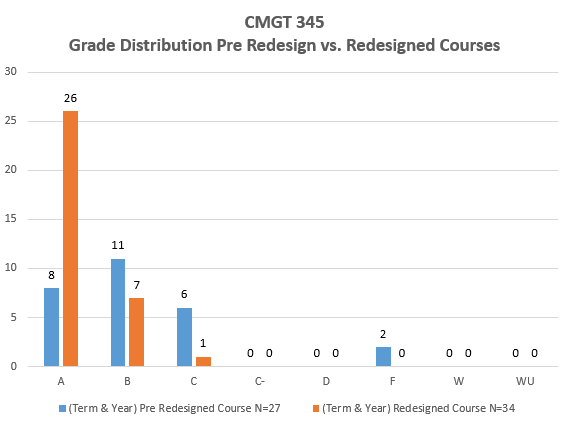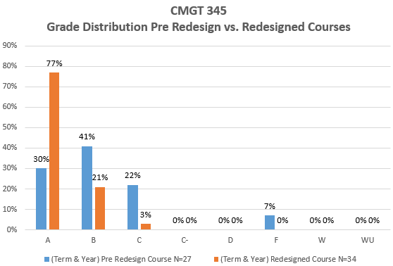 Based on the grade distribution from the CMTG 345 course redesign one can see that 77% of the class received an A, 21% of the class received a B, and 3% of the class received a C. Meanwhile, the course distribution of the course pre-design was 30% of the class received an A, 41% of the received a B, 22% received a C, and 7% of the class did not receive a passing grade. The grade distribution is a testimony on the impact of the course redesign strategies.